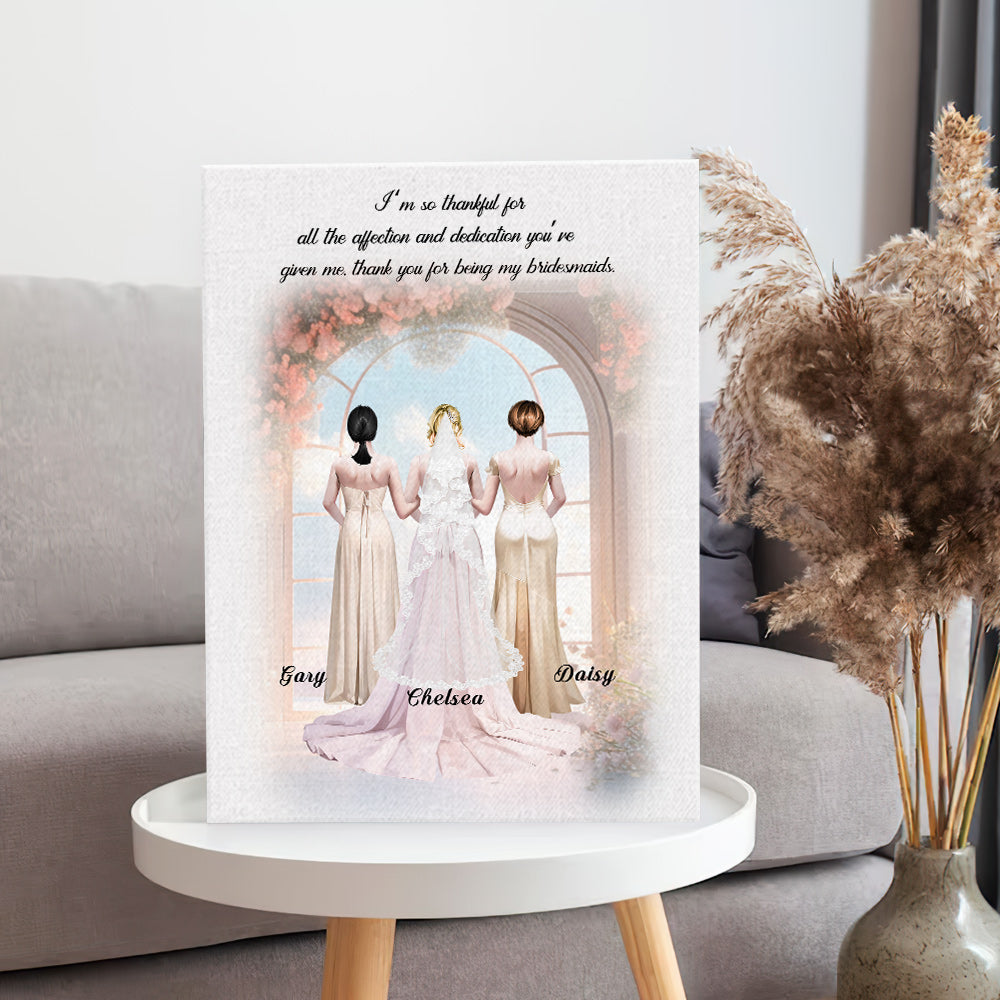 Personalized Bridesmaid and Bride Canvas Custom Wearing Hairstyle Background and Names