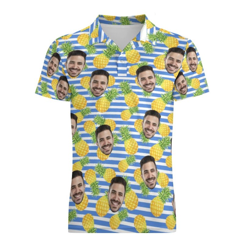 Men's Custom Face Polo Shirt Blue Stripes with Pineapples Personalized Hawaiian Golf Shirts