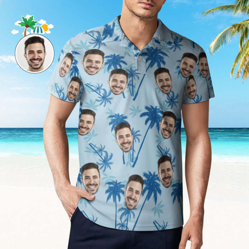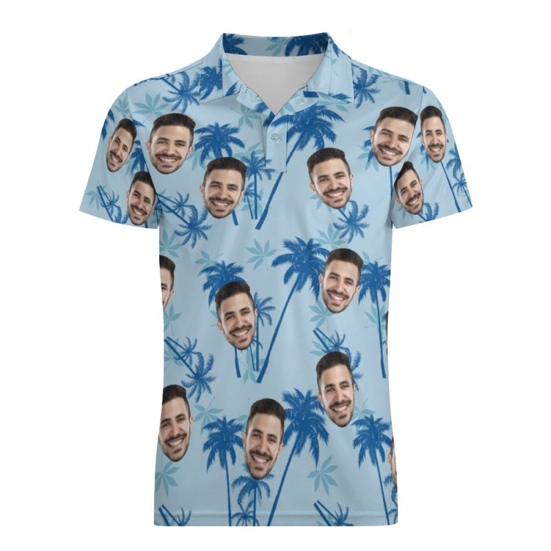 Men's Custom Face Polo Shirt Personalized Light Blue Hawaiian Golf Shirts