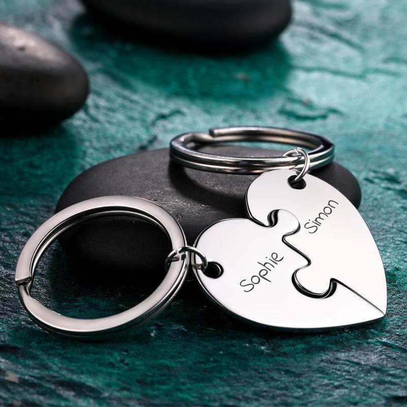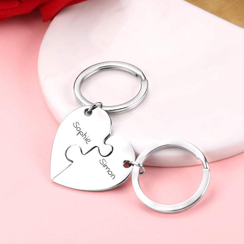 Personalized Keychain Custom Engraved Heart Puzzle Couple Keychain Set