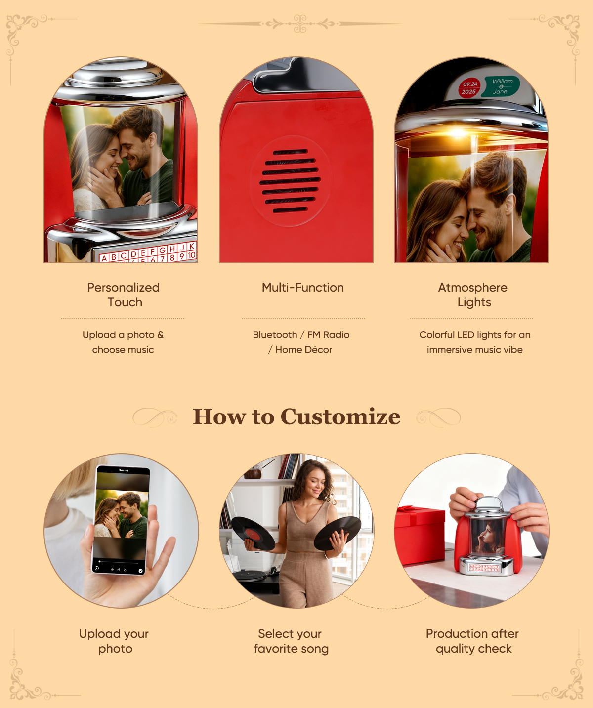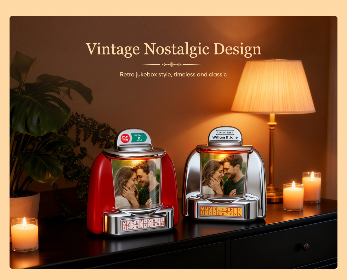 Custom Jukebox Retro Speaker – Personalized Photo,Names & Date Music Mini Player with Radio | Vintage Tabletop Home Decor Nostalgic Gift