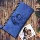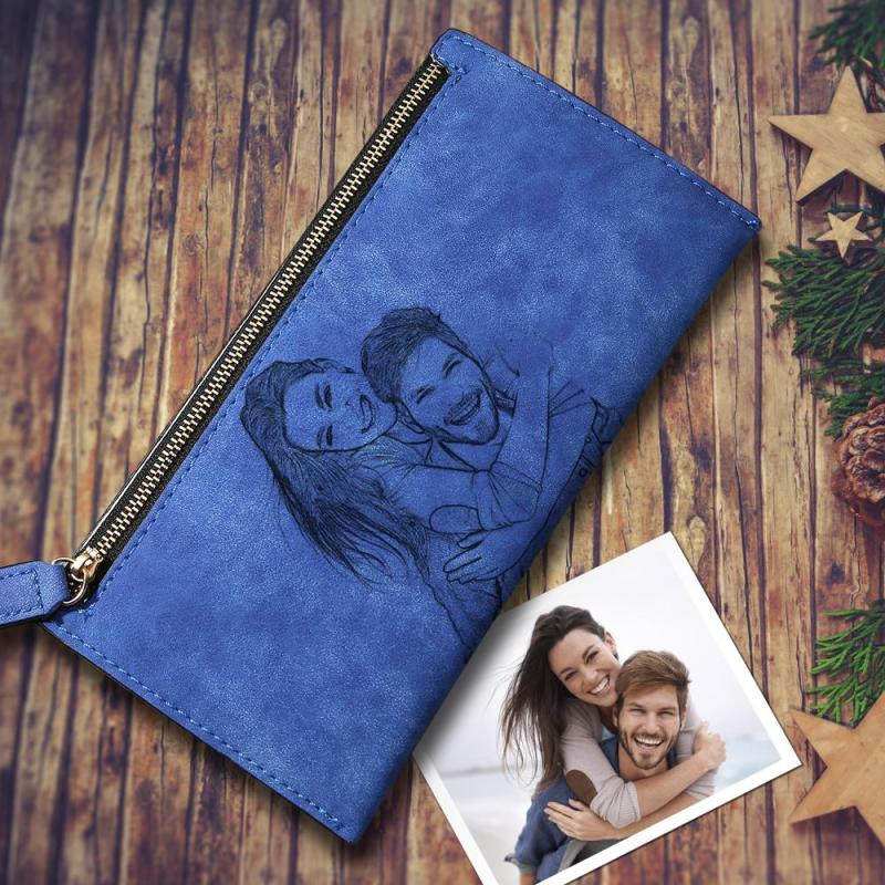 Women's Custom Inscription Photo Engraved Zipper Wallet - Blue Leather