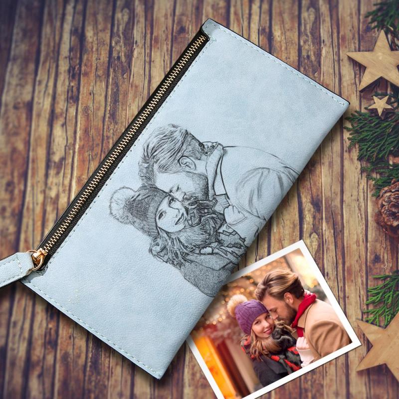 Women's Custom Inscription Photo Engraved Zipper Wallet - Light Blue Leather