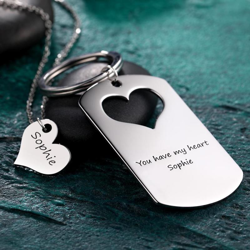Custom Engraved Couple Keychain and Necklace Set - Heart Dog Tag