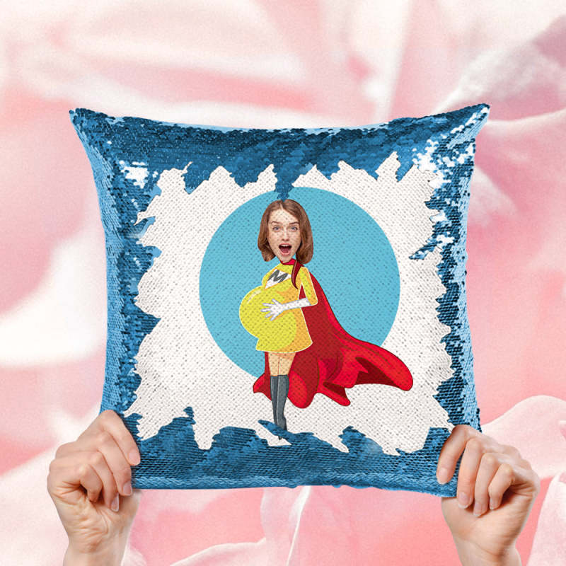 Custom Pregnant Super Mom Face Sequin Pillow Best Mother's Day Gift